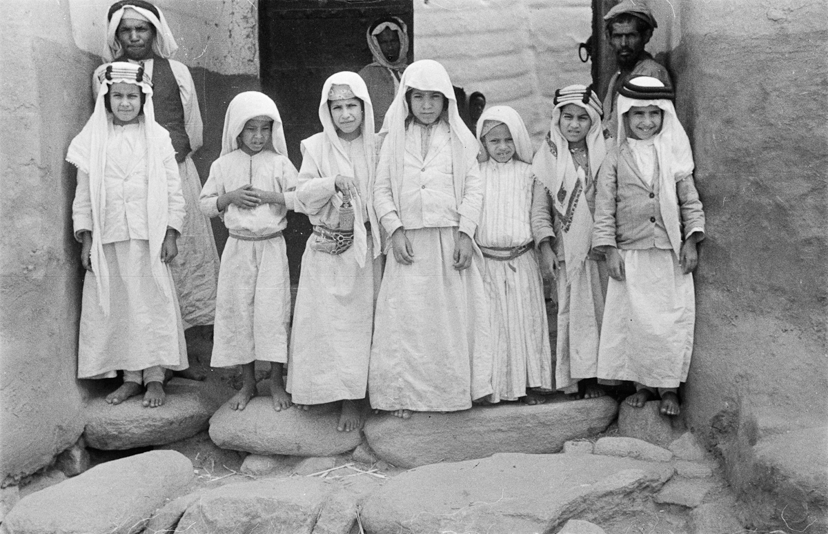 تجمع الصورة فتية من أسرة بن مشيط في عسير 1948 وآخرون من خدم القصر. ارشيف ويلفرد ثيسغر.