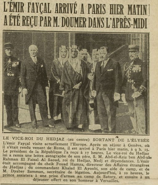 «وصول الأمير فيصل إلى باريس صباح أمس، وقد استقبله السيد دومير بعد الظهر»
