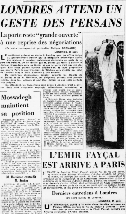 شهدت العاصمة الفرنسية باريس في السادس والعشرين من أغسطس لعام 1951م، وصول صاحب السمو الملكي الأمير فيصل بن عبد العزيز آل سعود، وزير خارجية المملكة العربية السعودية آنذاك، في زيارة دبلوماسية رفيعة المستوى قادماً من لندن. وقد حظيت هذه الزيارة بتغطية صحفية بارزة في جريدة ‘باريس-بريس، لانتيرانسيجون’ (Paris-Presse, L’Intransigeant)، التي أفردت تقريراً خاصاً في صفحتها الخامسة، تناولت فيه مراسم الاستقبال الرسمية ونتائج المباحثات السياسية المتعلقة بقضايا الحدود وشؤون الدفاع في المنطقة.