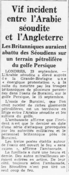 في وقتٍ كانت فيه خارطة النفوذ في منطقة الخليج العربي يعاد رسمها، برزت واحة ‘البريمي’ كواحدة من أكثر نقاط الصراع سخونة بين المملكة والاستعمار البريطاني. اليوم، نعود بالذاكرة إلى الخامس عشر من سبتمبر عام 1953، لنقرأ من خلال قصاصة لصحيفة فرنسية عاصرت تلك الأحداث، تفاصيل اشتباكٍ دموي وحادثة عنيفة أزهقت أرواح السعوديين الأبرياء، وهزت الأوساط الدولية، لتكشفت عن أطماع استعمارية لما تحت رمال الواحة الغنية بالنفط!
